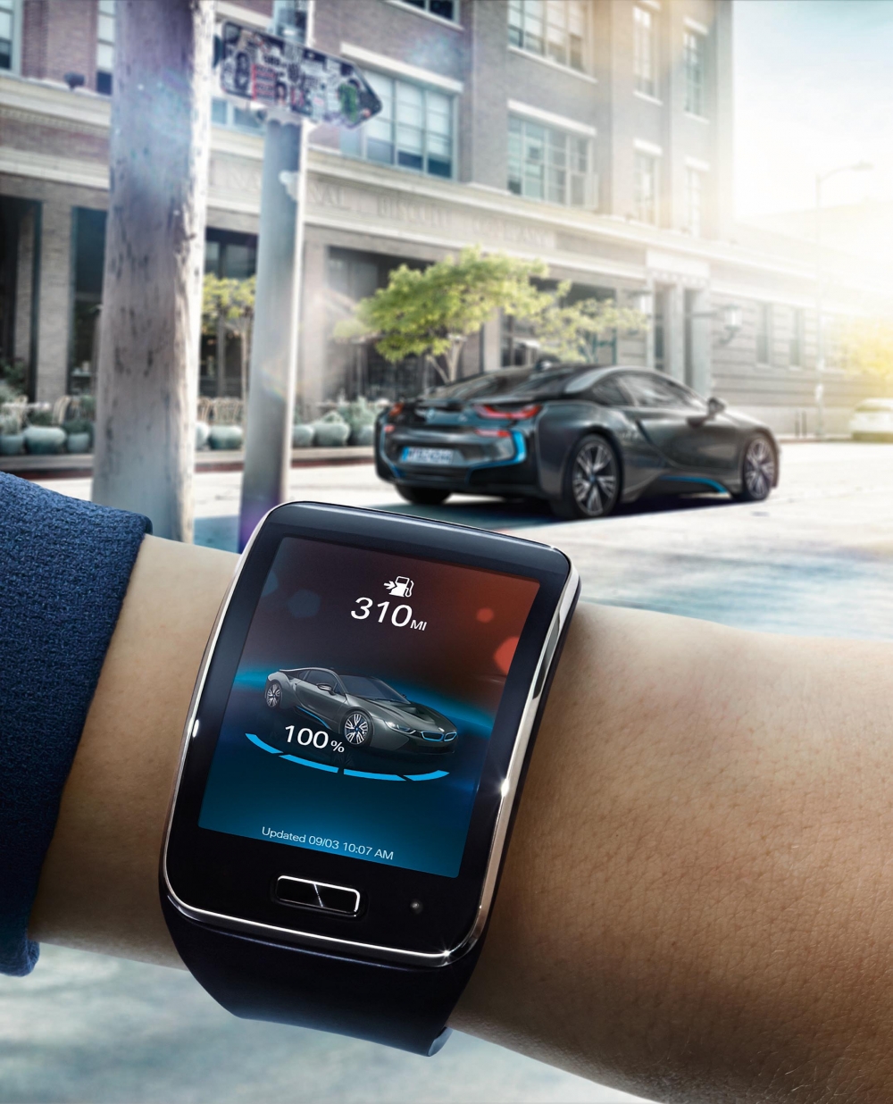 BMW i Remote App dla zegarka smartwatch Samsung Gear S to aplikacja łącząca bezprzewodowo kierowców samochodów BMW i z ich pojazdami za pośrednictwem ich zegarków. Zaprojektowano ją, by zapewnić dostęp do najważniejszych informacji w czasie rzeczywistym – jak możliwy zasięg elektryczny, poziom naładowania akumulatora, podczas ładowania zaś przewidywany czas ładowania, a także inne dane, które użytkownik może wybrać – jak choćby czy drzwi/okna/bagażnik są zamknięte. Za pomocą aplikacji można również sterować działaniem funkcji pokładowych., jak ogrzewanie czy chłodzenie wnętrza – które, jeśli będą przeprowadzone jeszcze podczas ładowania, zmniejszają później zapotrzebowanie na energię, a w żaden sposób nie zakłócają procesu ładowania.
